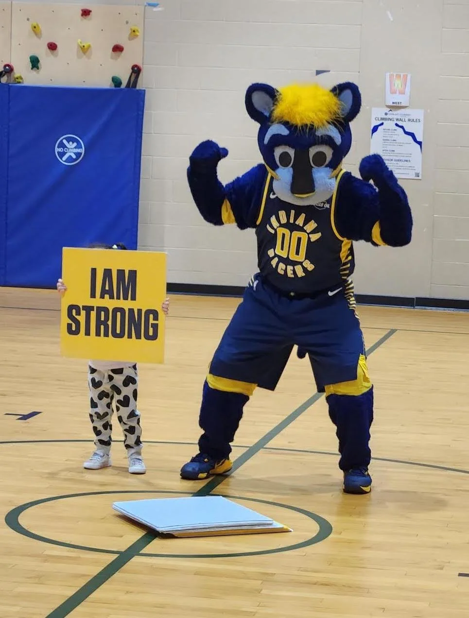 BOOMER: Let’s reach our schoolwide goal of $17,000 and welcome a special guest from the Indiana Pacers…BOOMER, to put on an electric show for our school!
